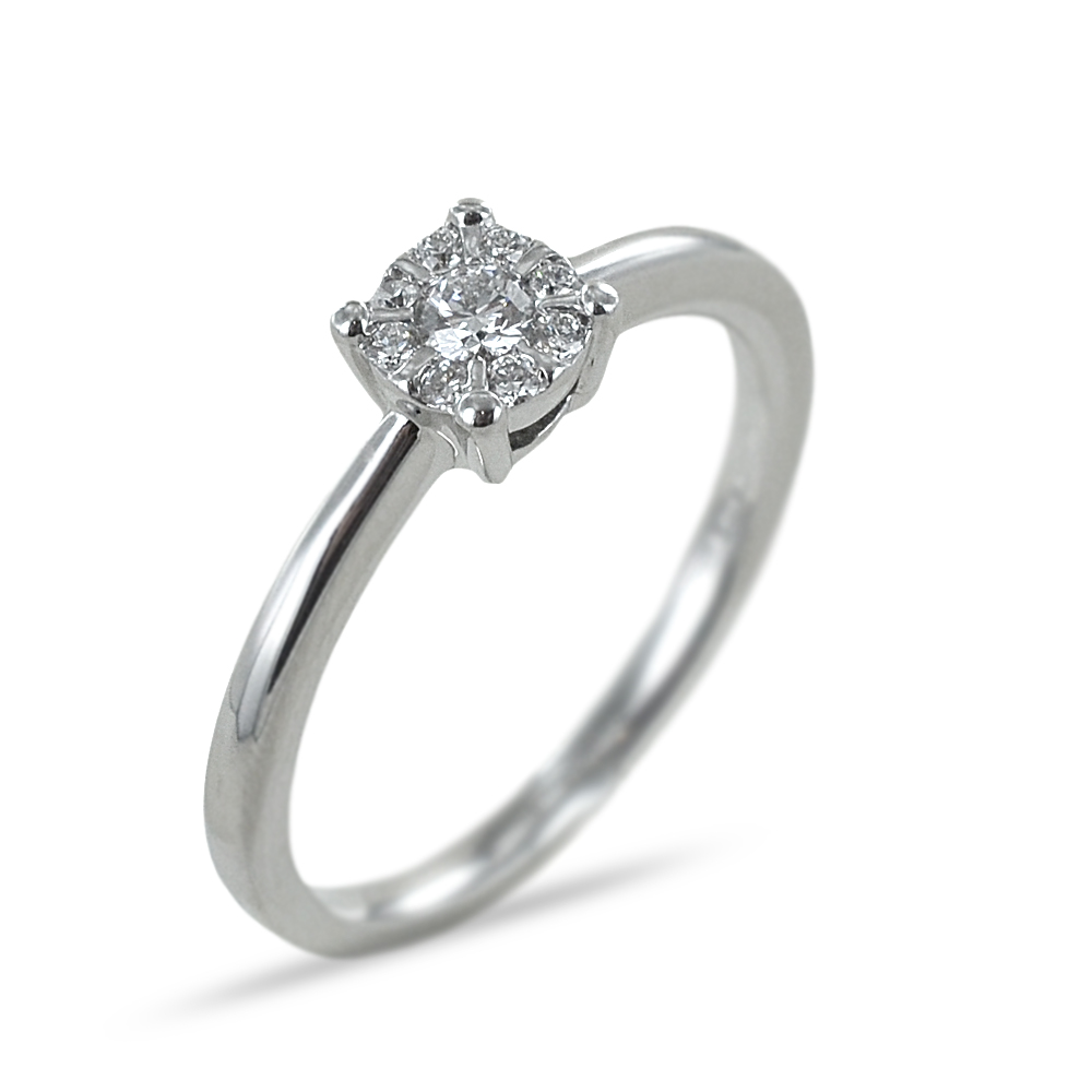 Questo anello è ad effetto solitario, con incastonatura chiamata "magic", questa rende proprio l'effetto di un unico diamante, mentre ne sono incastonati 9, uno grande al centro e 8 più piccoli intorno, per una caratura totale di 0.14.