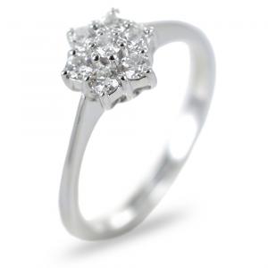 Questo anello a fiore di diamanti è un modello molto classico ma con mojtatura moderna, difatti i diamanti sono incastonati con griffes molto vicino tra loro a farlo sembrare un fiore unico, è un modellod i anello detto anche anello rosetta di diamanti.