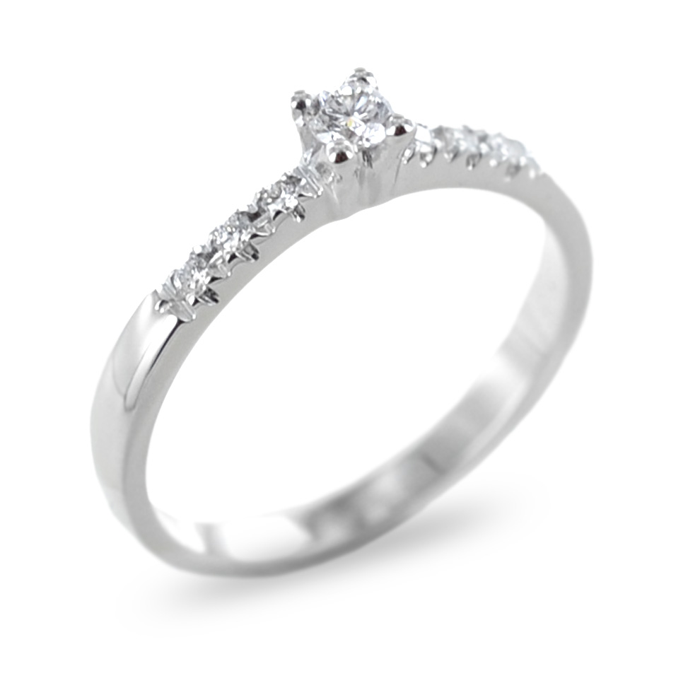• anello solitario con al centro un diamante naturale, taglio brillante rotondo, carati totale 0.10, colore G, purezza VS