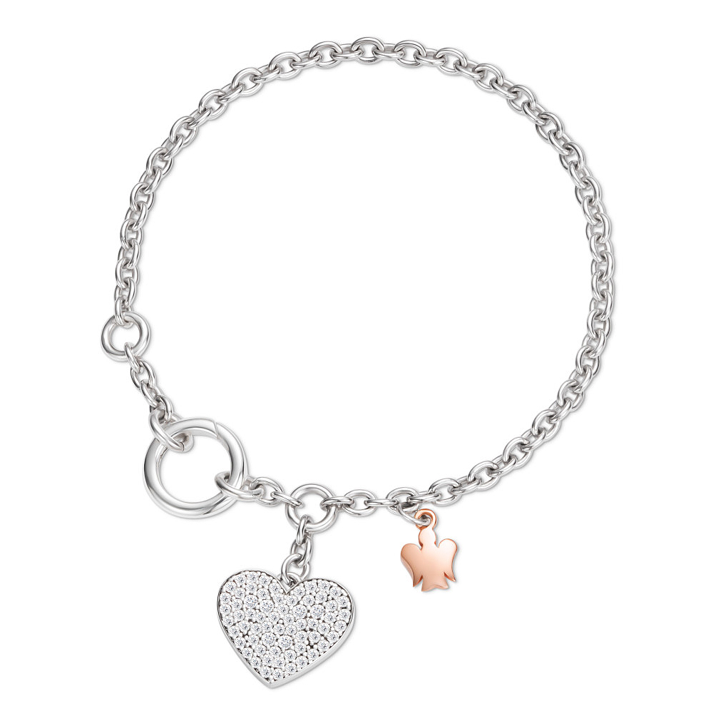Bracciale in Argento Roberto Giannotti. Bracciale con elemento Cuore con zirconi bianchi e angelo in argento rosato. Dettaglio iconico Angelo di dimensioni 7 x 8 mm, dimensioni del cuore 1.30 x 1.50 cm. Lunghezza totale del Bracciale 18 cm con possibilità di regolazione, con chiusura a moschettone.