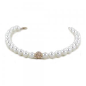 Questo braccialetto di perle è un moderno bracciale a filo di perle di media grandezza, le perle di diametro 6.50-7.00 mm infatti rientrano nella categoria di perle medie. Il bracciale in questione è un modello moto giovanile, grazie alla sfera brillante in oro rosa posta al centro del bracciale, essa è una sfera in oro rosa a lavorazione diamantata, per cui estremamente luminosa, lo rende un bracciale da  donna e da ragazza moderno e trendy, che si abbina benissimo ad occasioni sia formali che non.