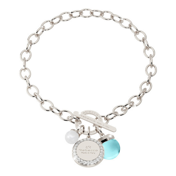 Bracciale da donna con charms GIOIELLI REBECCA. Bracciale in bronzo di lunghezza regolabile fino ad un massimo di 20 cm, con charm rebecca con strass e pendenti con pietra azzurra e perla. Chiusura a moschettone