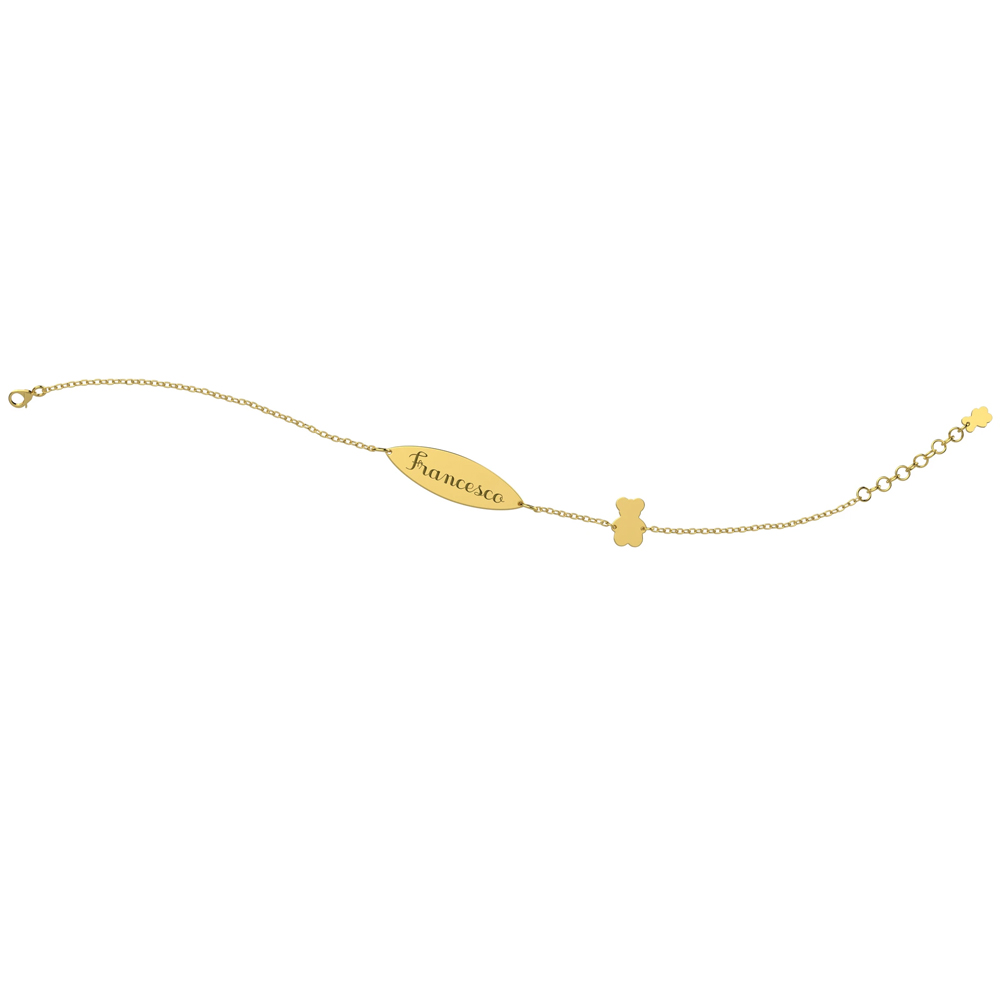 Bracciale da bambino/a Nanan in oro 9 kt con orsettoe targhetta per l'incisione del nome.