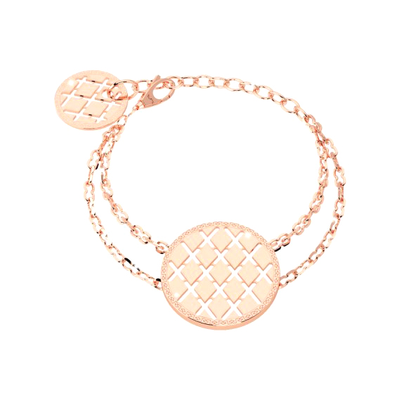 BRACCIALE DA DONNA IN BRONZO PVD ORO ROSA EFFETTO LUCIDO, LA CATENA DI LUNGHEZZA REGOLABILE DA 14.50 CM A 17 CM E' FINEMENTE LAVORATA CON UN EFFETTO MOLTO LUCENTE. SULLA CHIUSURA RIPORTA UN PENDENTE ROTONDO DI DIAMETRO 18  MM. ELEMENTO ROTONDO CENTRALE DI DIAMETRO 27 MM.