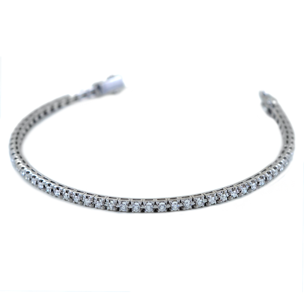 Questo bracciale è molto elegante ed ha una bella luminosità, l'incastonatura dei diamanti è a griffes, ed i castoni sono lineari. La chiusura di questo braccialetto tennis è a scatto con doppia sicura .