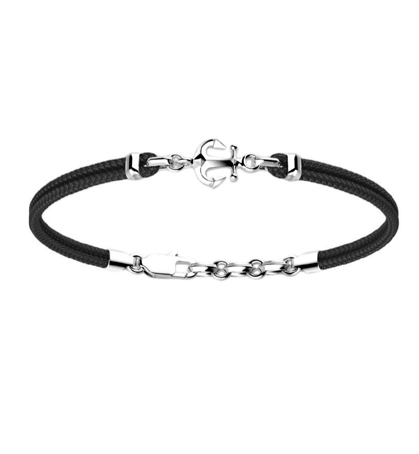 Bracciale in argento 925/000 e tessuto nautico con ancora in argento centrale. Colore del bracciale nero, chiusura a moschettone in argento. Lunghezza del bracciale 21cm.