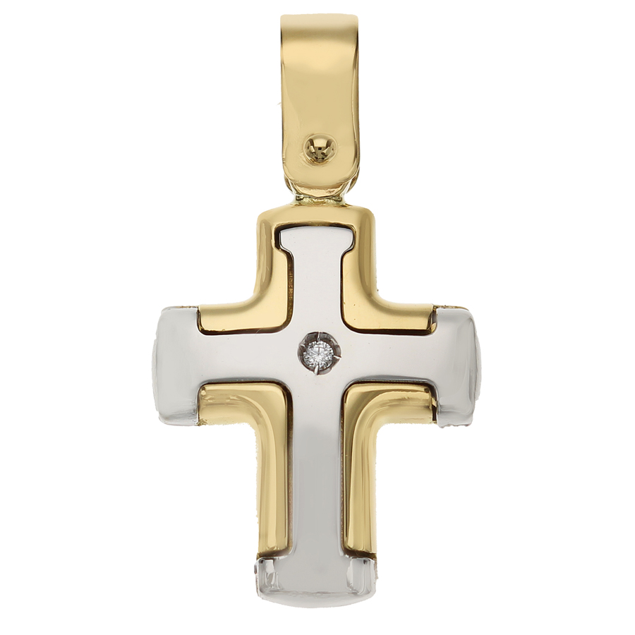 Il ciondolo a forma di croce è in oro giallo ed ha dei dettagli in oro bianco così come la contromaglia, al centro vi è incastonato uno zircone, che lo render in ciondolo religioso molto elegante e raffinato, rimanendo comunque nel genere unisex, per cui è un ciondolo a croce con zircone adatto ad un pubblico maschile e ad un pubblico femminile.