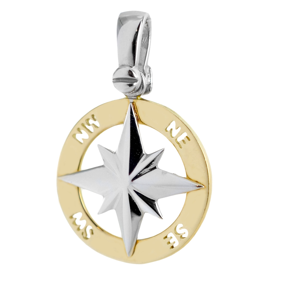 Ciondolo a forma di rosa dei venti in oro giallo e bianco a titolo 18kt. Il ciondolo è a finitura lucida sia sulla parte frontale che sul retro. Il diametro del ciondolo (esclusa la contromaglia) è 16 mm circa. Ciondolo corredato da collana in tessuto di colore nero