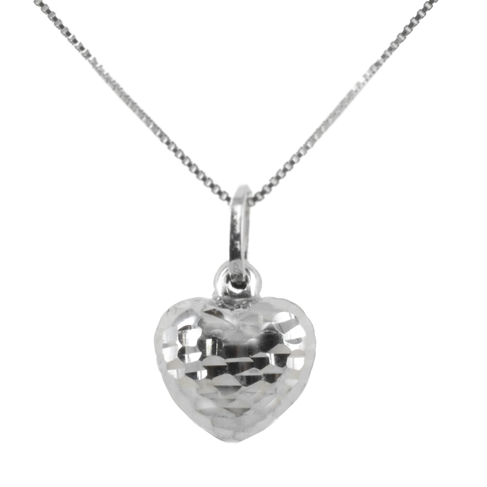 La collana con ciondolo a forma di cuore bombato in oro bianco, a finitura sfaccettata, è un gioiello molto lucente e dall'effetto luminoso, grazie alla particolare lavorazione della superficie. L'abbinamento del ciondolo in oro con la catena in argento permette di indossare o regalare un gioiello completo ad un prezzo veramente vantaggioso.