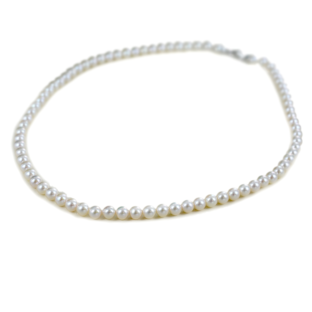 Collana filo di perle Akoya; le perle akoya nascono dall'ostrica Pinctada Futada Martensii, meglio nota come ostrica Akoya. Sono perle di eccellente lustro ed il loro colore è tendenzialmente bianco con riflessi che possono variare dal rosa, all'avorio all'argento. Le perle Akoya vengono coltivate per la maggior parte in Giappone ed in Cina, Vietnam ed Australia. Questo filo di perle Akoya è composto da perle coltivate in Giappone.
