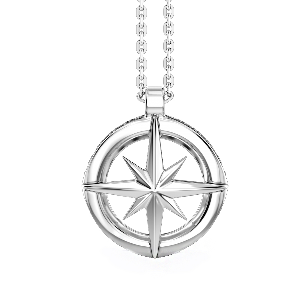 Collana Zancan da uomo in argento 925/000 con catena in argento di lunghezza 50cm con chiusura a moschettone. Pendente a forma di rosa dei venti in argento con spinelli neri. Diametro del pendente 18 mm  circa.