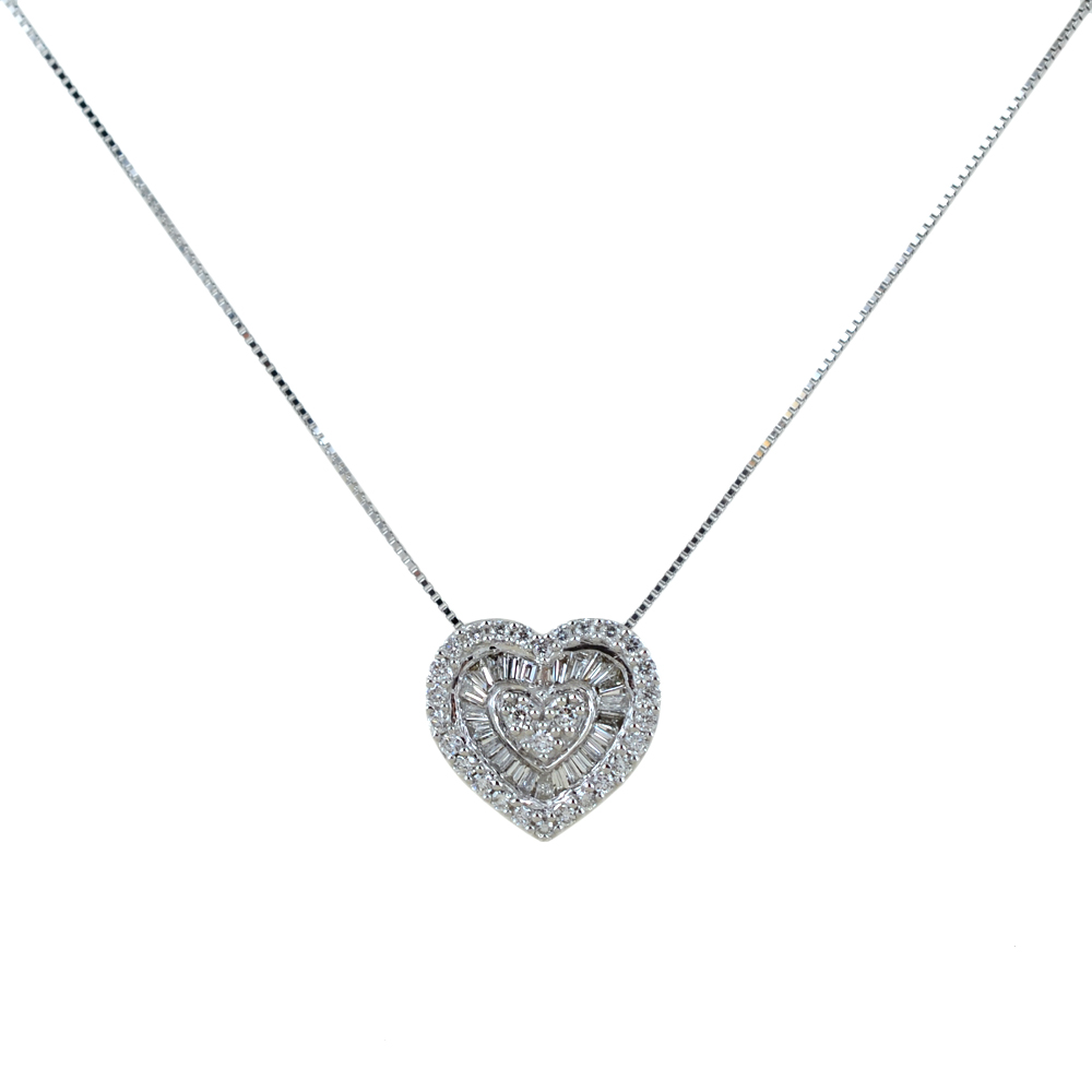 Collana con ciondolo a forma di cuore di diamanti baguette contornati da diamanti taglio brillante rotondo consegnata in scatola da gioielleria e accompagnata da certificato di garanzia e autenticità, completa di documentazione fotografica del gioiello.