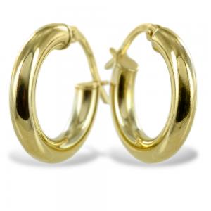 Gli orecchini a ciambella più piccoli sono il modello da 16 mm, che come grandezza rientrerebbe nella dimensione media di orecchini a cerchio, ma di fatto sono il modello più piccolo di questa collezione di orecchini a campanella da 3 mm di spessore. Questo modello di orecchini a cerchio in oro giallo esiste in tre misure differenti: 16 mm, 22 mm e 26 mm. Tutti e tre i modelli esistono sia in oro giallo che in oro bianco.