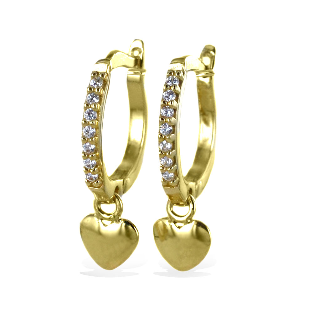 Orecchini a cerchio piccoli in oro giallo con zirconi e charm cuori