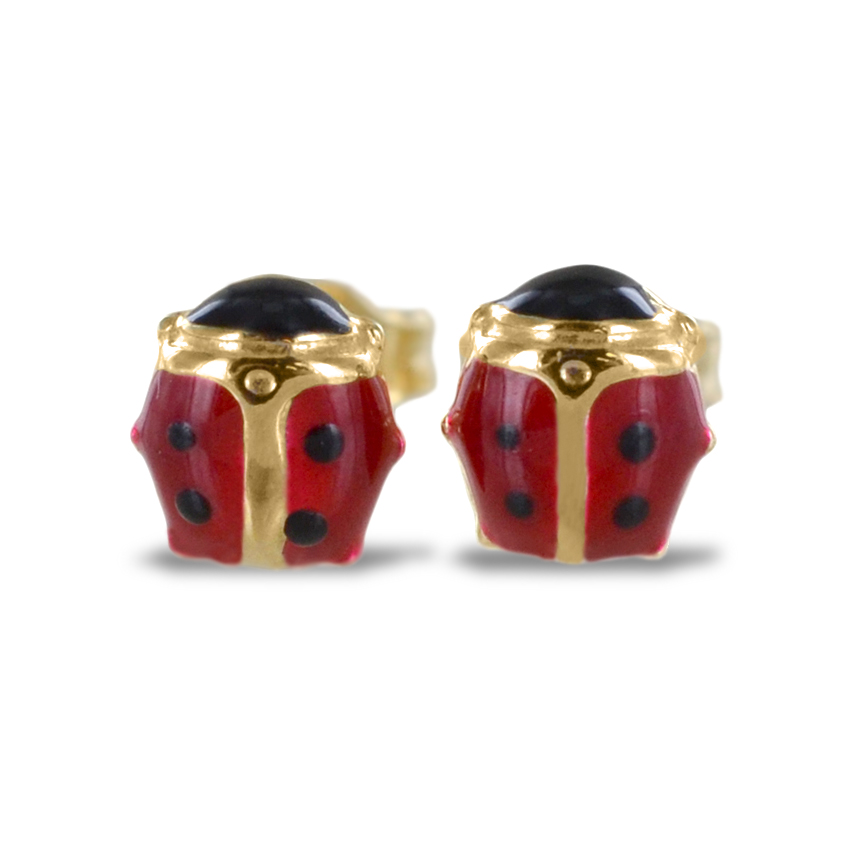 Orecchini da bambina in oro giallo con coccinelle. Questi orecchini a bottoncino da bambina sono orecchini con coccinelle, e sono il modello di orecchini mini, infatti le coccinelline misurano 4.70 x 4.30 mm.
