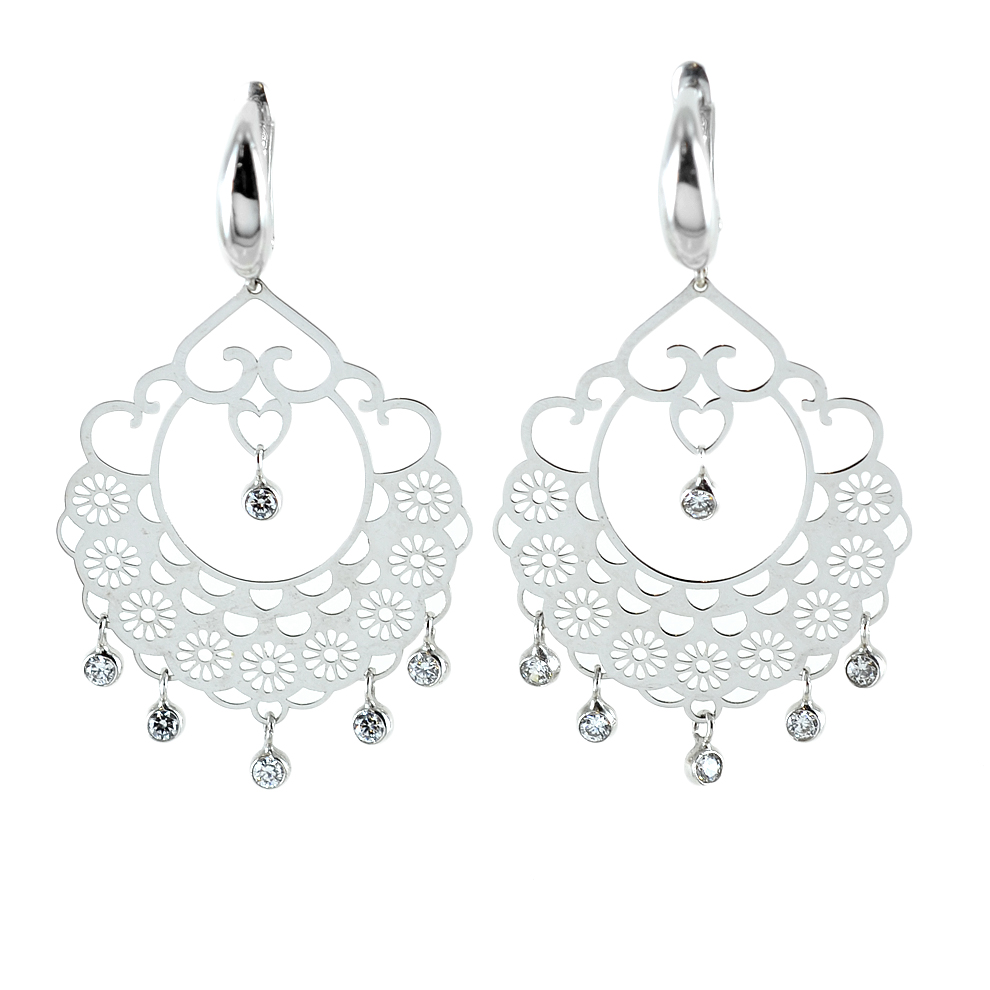 Questi orecchini sono un gioiello molto ricercato adatti ad una signora dai 30 anni in su, sono realizzati con una particolare lavorazione che li rende un paio di  orecchini damascati ad effetto lavorazione di pizzo, ed hanno dei bellissimi ciondolini in oro bianco con zircone centrale, a donare luminosità al volto. la superficie è liscia e lucida, per dare maggiore risalto alle traforature effetto pizzo che hanno questi orecchini.