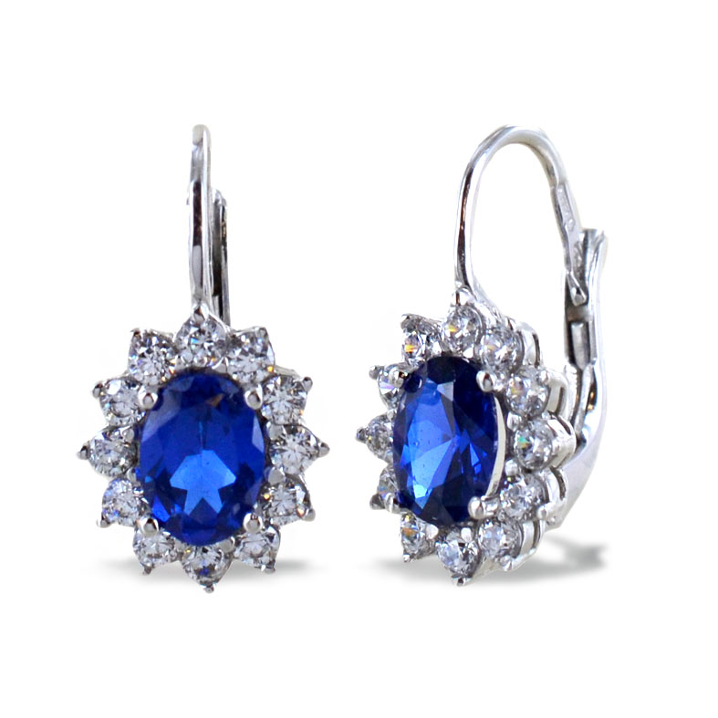 Orecchini molto classici a forma di rosetta con pietra centrale blu colore zaffiro, e contorno di pietre di colore bianco. le pietre che compongono questi orecchini sono zirconi, luminosi e bellissimi, conferiscono un tono importante a questi orecchini classici a rosetta, a pendente.