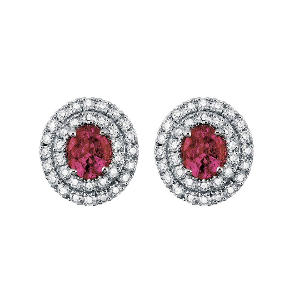 Orecchini Salvini in oro bianco a titolo 18 kt con Rubino con doppio contorno di diamanti. Orecchini Salvini della collezione Dora con Rubino centrale a taglio ovale e luminoso contorno di diamanti. Rubino centrale taglio ovale per carati 0.74, dimensioni della pietra 5,08 X 4,19 mm. Diamanti naturali taglio brillanto rotondo, per carati 0.47,colore GH, incastonatura a griffes. Dimensione complessiva degli orecchini 10,05 X 9,10 mm.