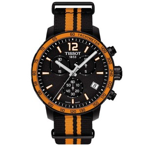 Orologio Tissot da polso per uomo collezione QUICKSTER con cassa in acciaio PVD nero di diametro 42mm. Quadrante nero con indici e vetro zaffiro antigraffio. Cinturino NATO in tessuto con chiusura a fibbia in acciaio PVD nero. Resistente all'acqua (Water Resistant) 10 atmosfere (100m). Movimento al quarzo calibro G10.211 Swiss made. Funzione di cronografo e datario.