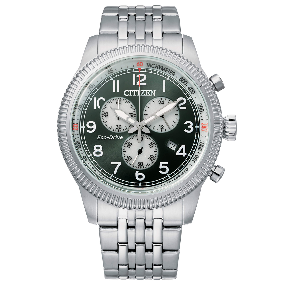 Orologio da polso Citizen per uomo Eco Drive. Cassa in acciaio diametro 42 mm con fondo serrato a vite. Quadrante verde e vetro minerale a doppia curvatura. Bracciale in acciaio con chiusura deployante. Movimento Eco Drive a carica luce con riserve di carica di 270 giorni. Resistente all'acqua (water resistant) 10 atm (100m). Cronografo fino a 60 minuti.