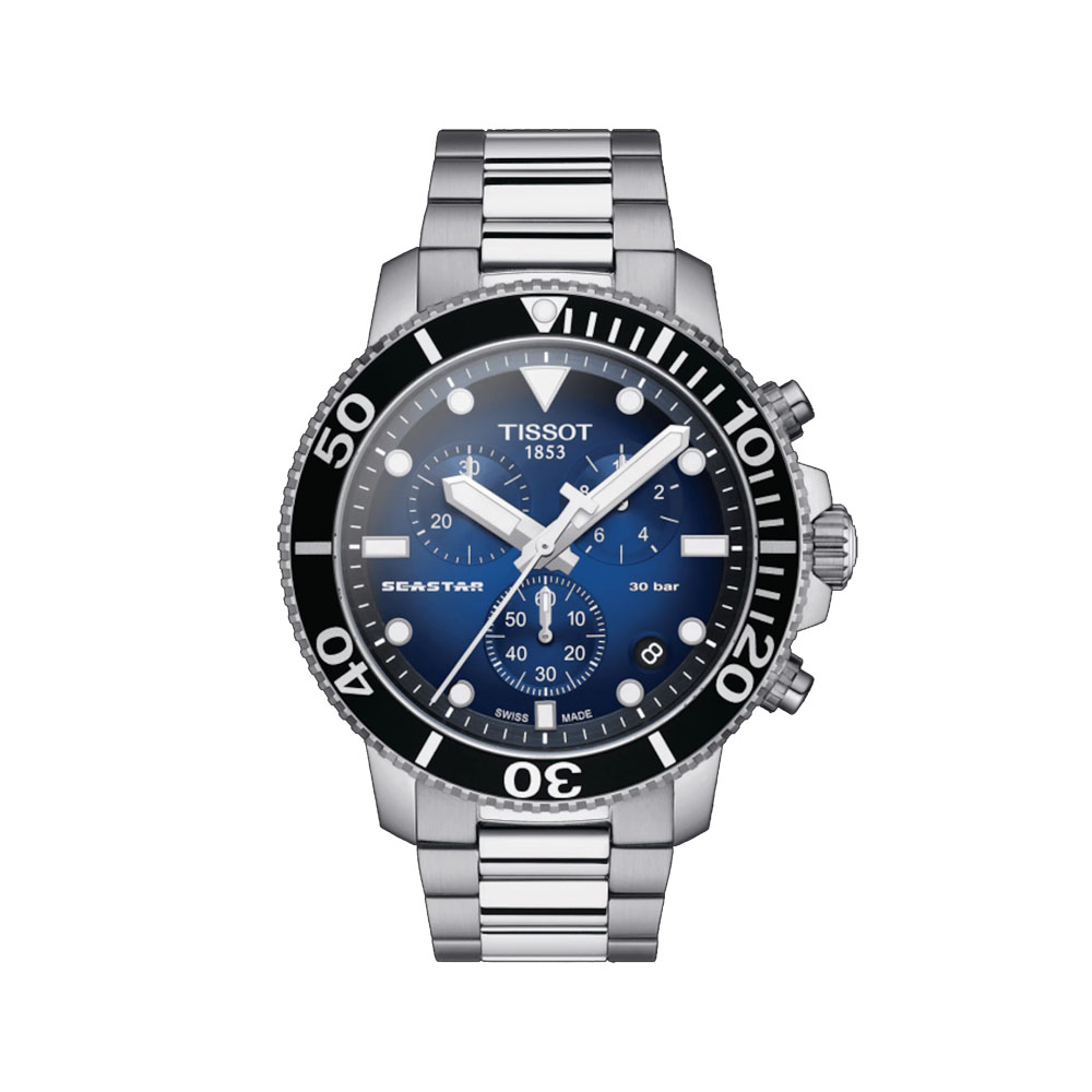 Il Tissot Seastar 1000 è l'orologio per gli amanti del mare per eccellenza grazie all'elevata impermeabilità fino a 30 bar (300 m/1.000 ft), al binomio fondello e corona a vite e ad una lunetta unidirezionale in ceramica. Il modello monta un movimento automatico.