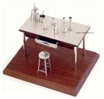 Tavolo da biologo o chimico con piano in argento 925/000 e base in legno pregiato. Particolari becher e beute sul piano di lavoro e fornellino. Cassetto aperto in argento. Lavorazione dell'oggetto seguendo la interamente fatta a mano.